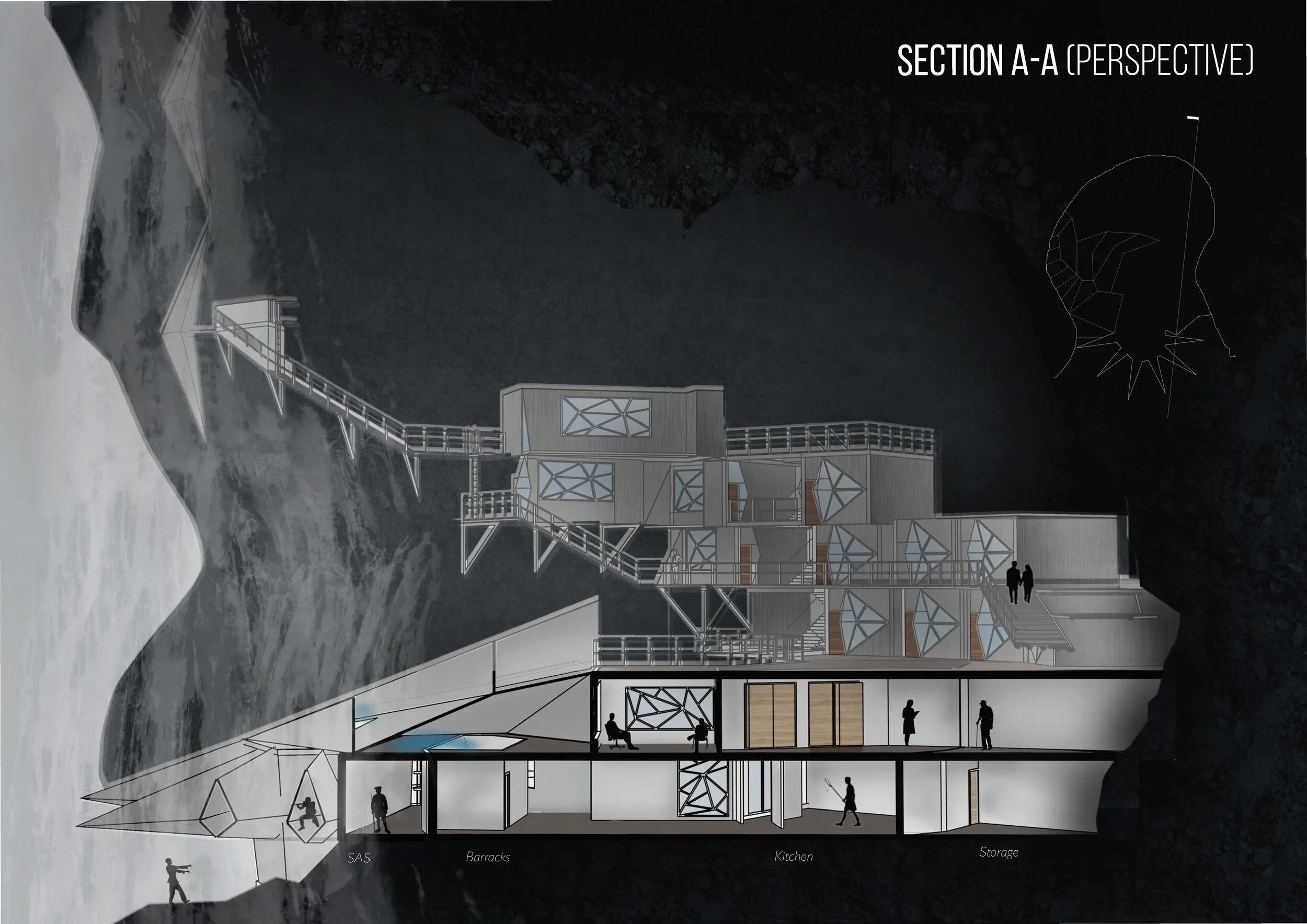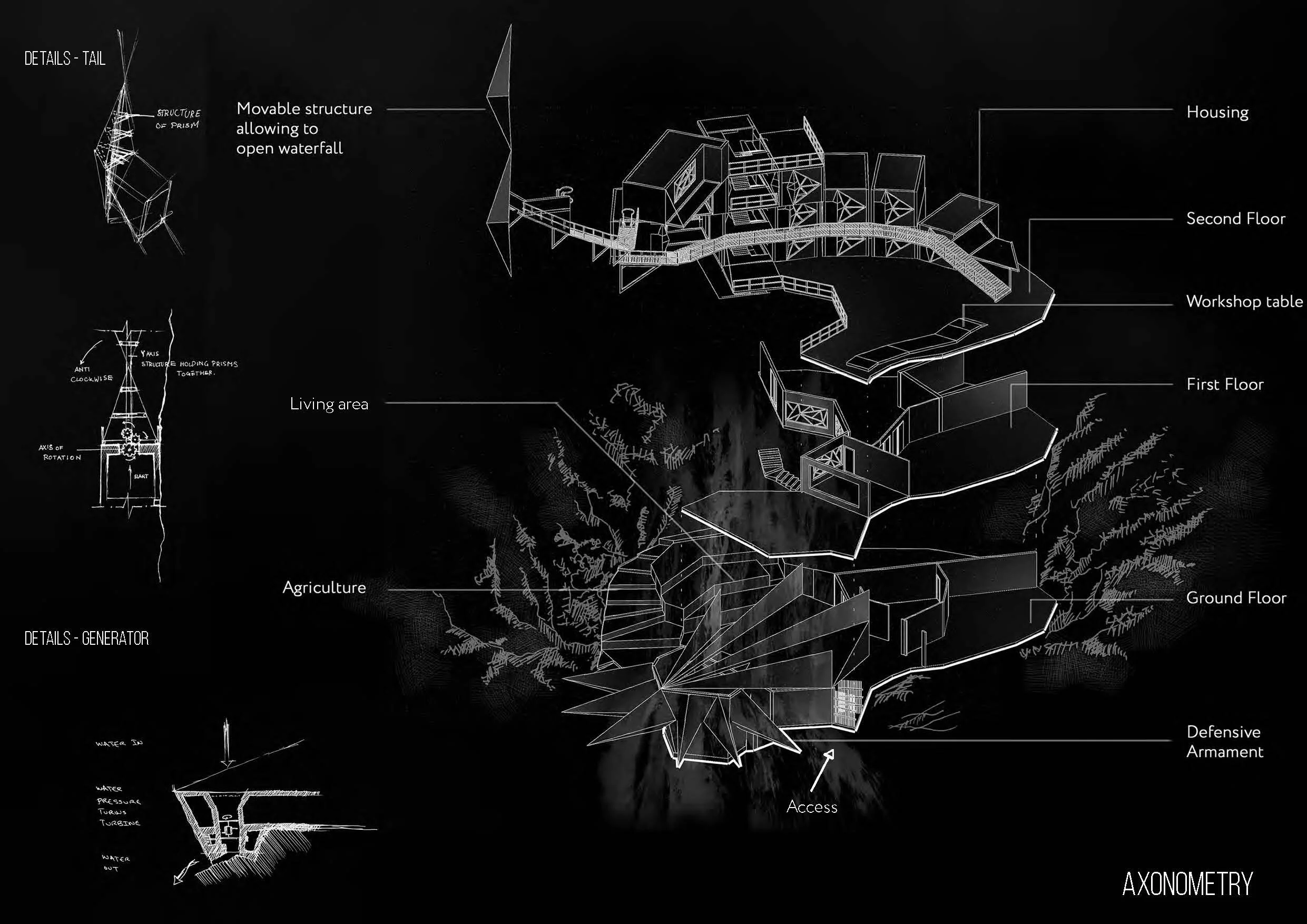 The name “Atheris” is taken from a snake found in the rainforest areas of Sub-Saharan Africa and which implies “at your own risk” in French. Atheris is a project constructed behind a waterfall and forms part of the Zombie House Series which is focused on developing a safe and defensive house where survivors of a Zombie Apocalypse could take refuge. This project is the answer to this fictional yet bleak and dark world. In addition to scaring and pushing back the zombies, this project is self-sufficient. It produces its own electricity by using hydroelectric energy, its own food supplies by using agriculture and farming and its own water supply.