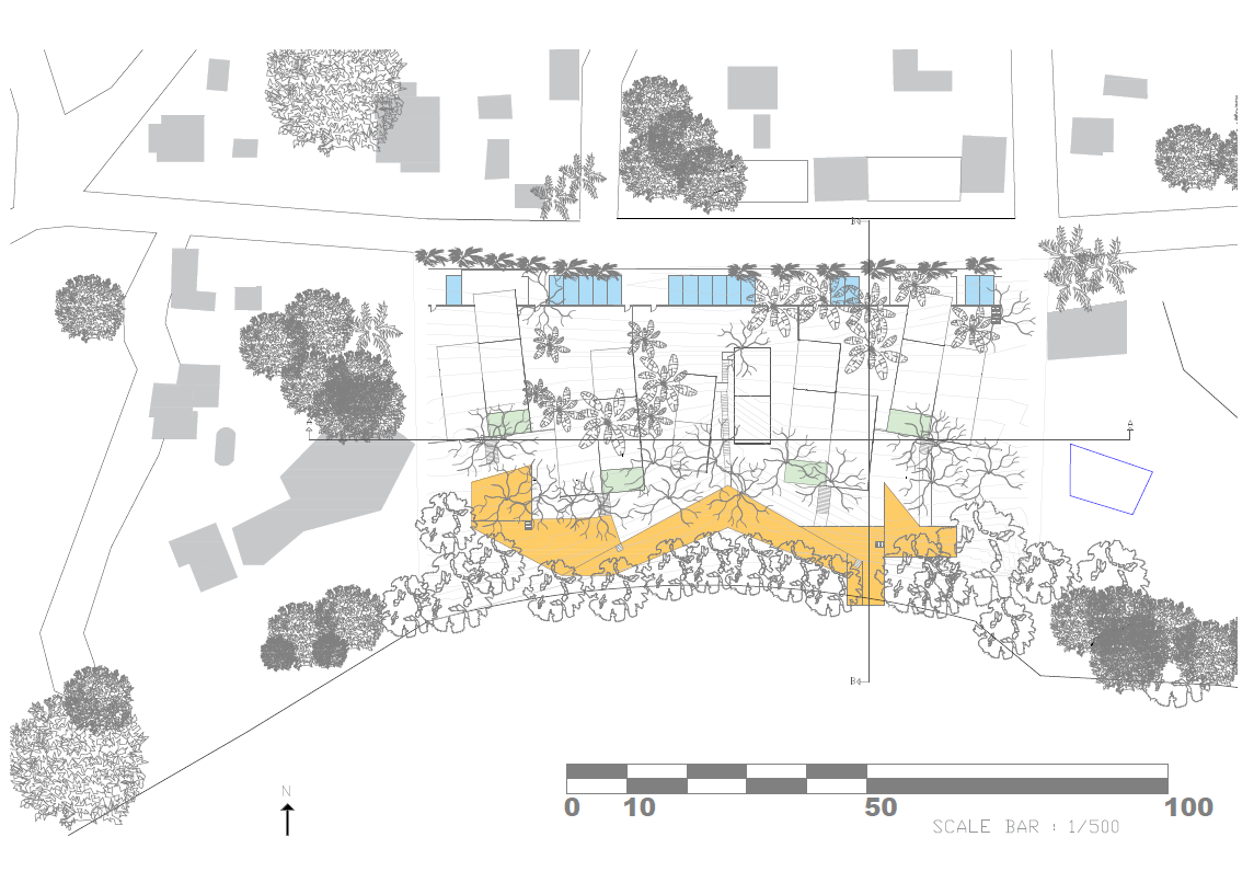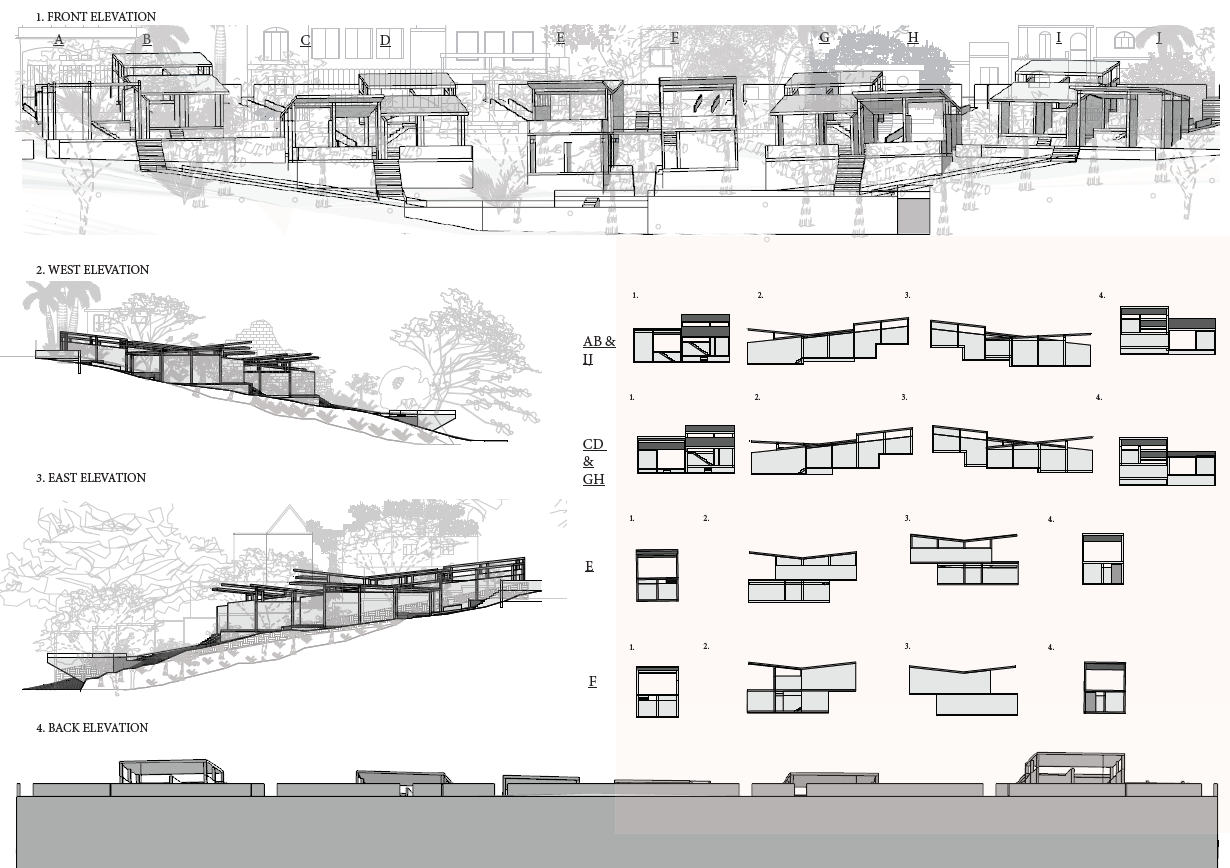 The houses differ from sizes, terraces, heights of roofs (for better ventilation and lighting), and orientations (to adapt to the vegetation and slope). The project also ensures that the existing neighbourhood could see the ocean.