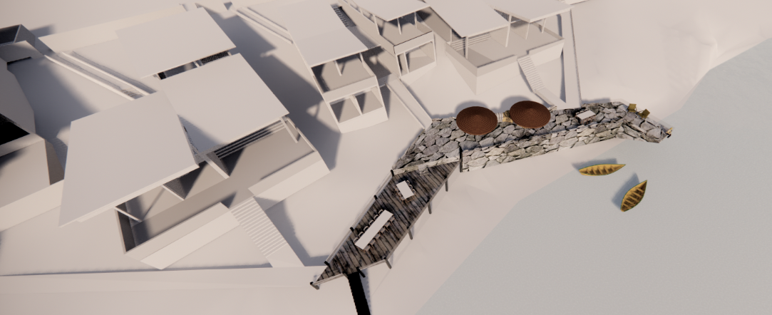 The common space which takes into consideration the topography and vegetation has different levels connected to the houses with an extension to the sea. Stone benches and tables have been placed for the inhabitants to relax, have barbecues and parties with family and friends.