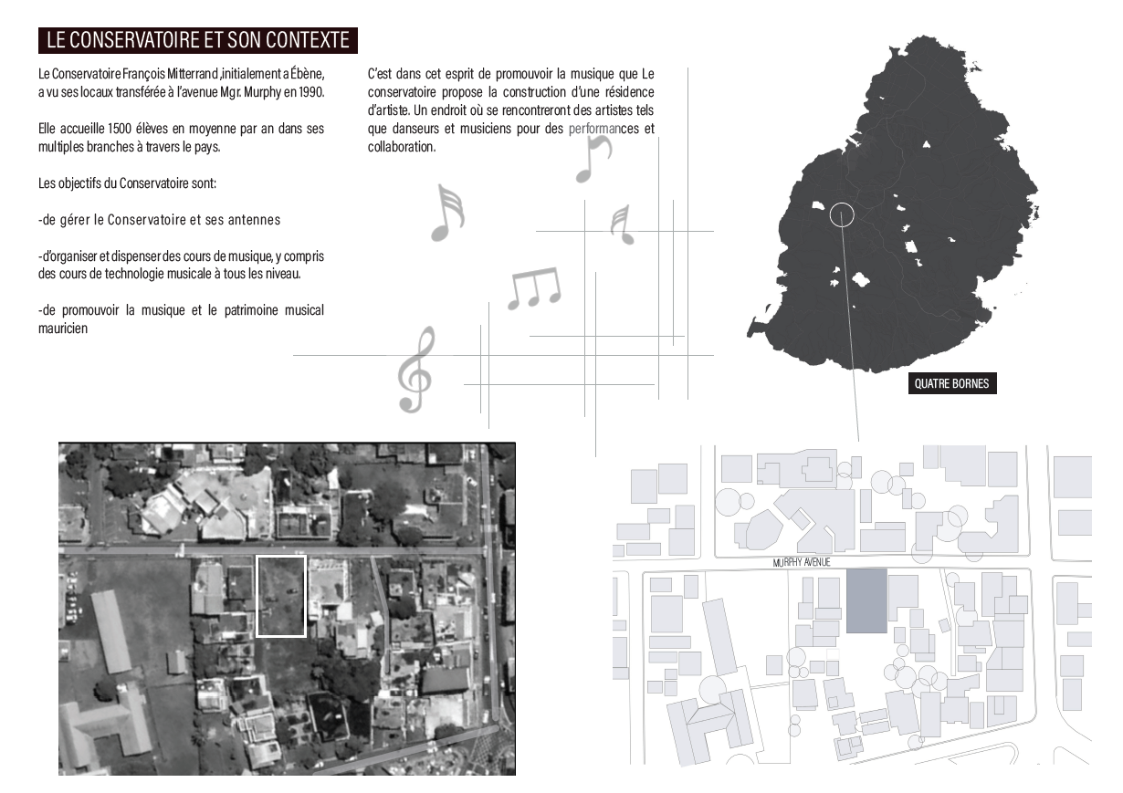 The François Mitterrand Conservatory welcomes 1500 students on average per year in its multiple branches across Mauritius. The main objectives of the Conservatory are to organize and deliver music lessons at all levels and to promote the musical heritage of Mauritius. In this respect, the Conservatory proposed the construction of an artist's residence, where artists such as dancers and musicians will meet for performances and collaboration.