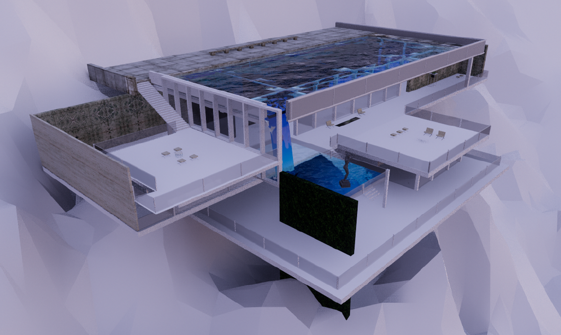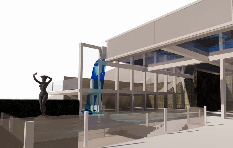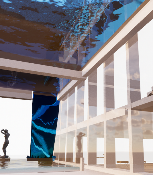 My imagination gives rise to an elegant museum with a transparent pool as its roof leading to a unique ambiance.