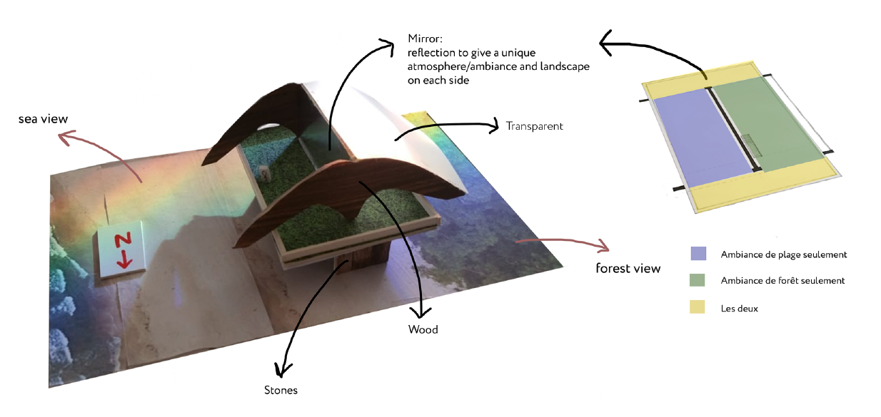Illusion was created by the big wooden bird-like structure and reflected materials used (mirror and glass) which offer different ambiances.