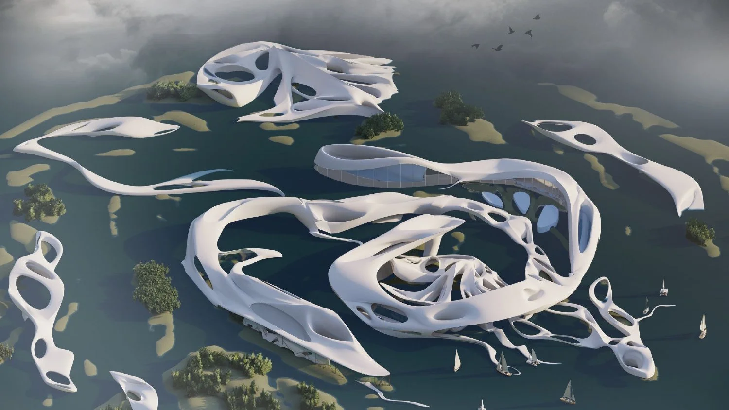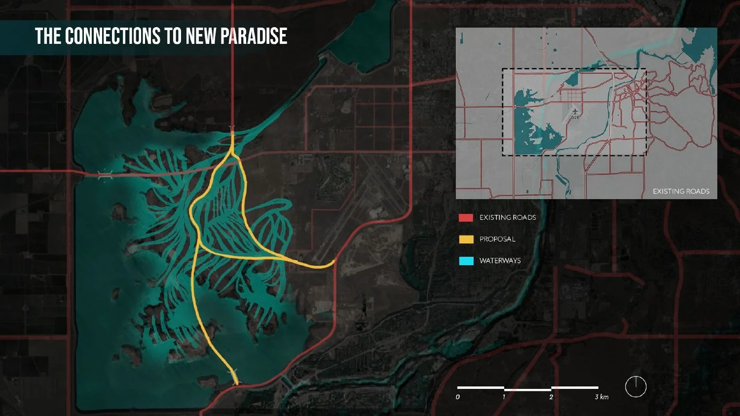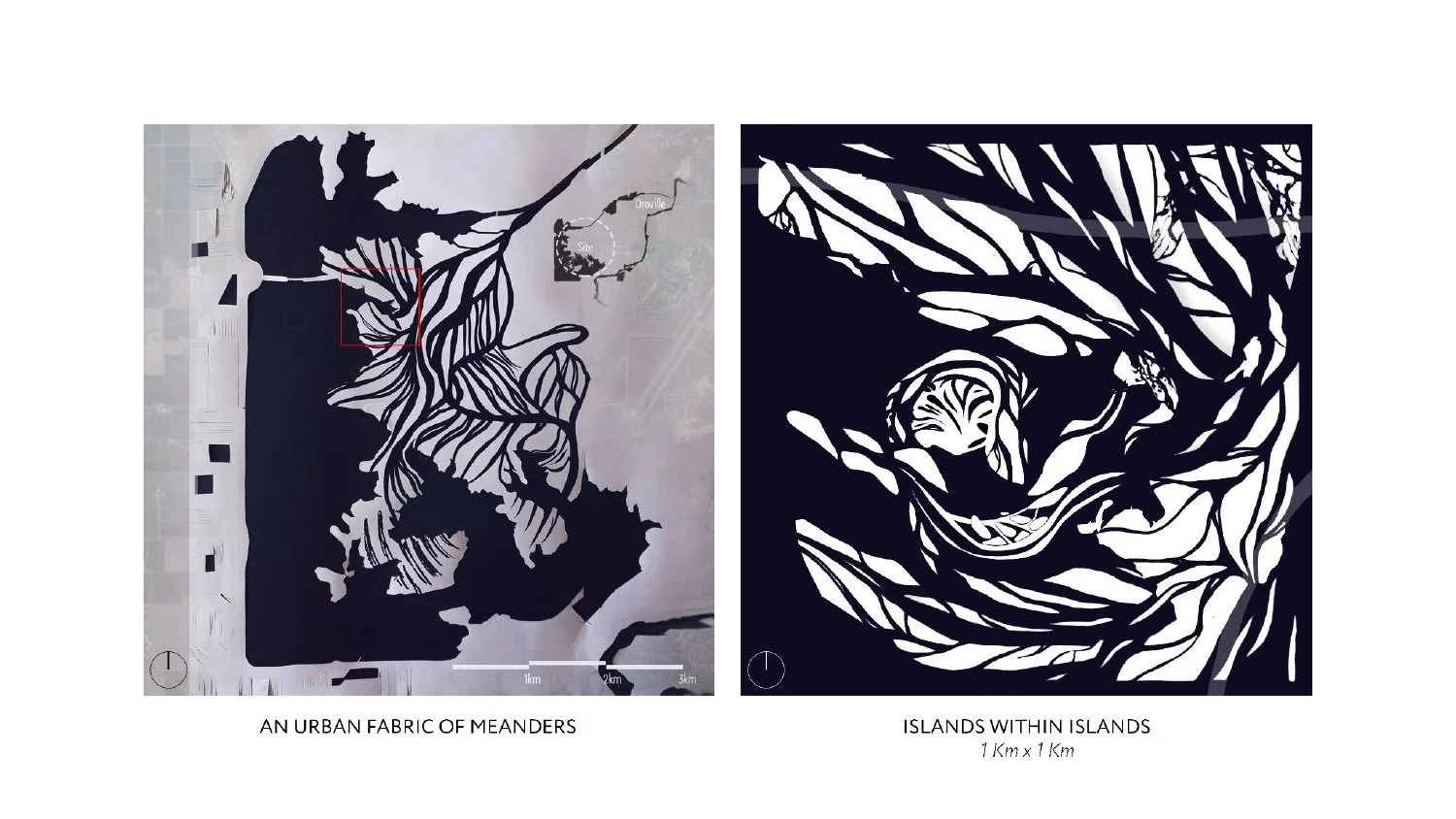 Le fleuve et les bassins entourant Oroville, nous permettent donc de trouver notre inspiration dans les grands fleuves du monde. La présence de l’eau, ennemi naturel du feu, constitue l’essence même de ces fleuves et a guidé notre concept vers la création d'îlots entourés de rivières et de lacs. Les formes des grands fleuves contribuent à établir un modèle issu du vivant que nous avons adapté à la baie de Thermalito pour qu’elle puisse se protéger des feux sauvages. Suivant cette logique, nous avons donc pris ces motifs issus des méandres du fleuve du Mississippi, et avons superposé ce motif sur notre site, ce qui nous a permis d’établir un plan général dans lequel la zone urbaine d’Oroville pouvait s'étendre et se développer.