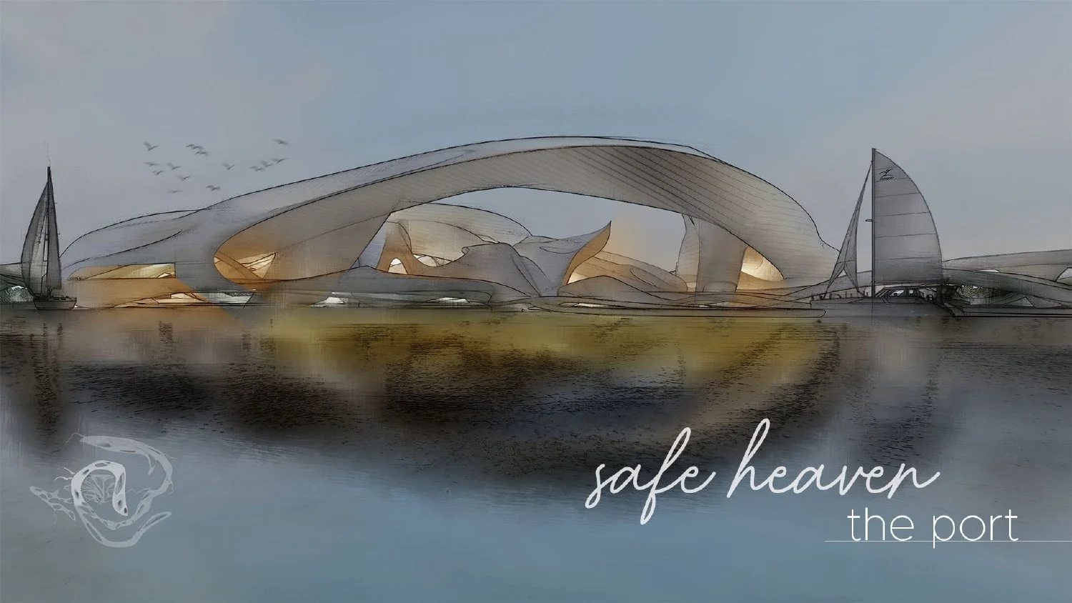 Notre projet se pose sur la zone de 1km2 en forme de spirale pour augmenter l’exposition à l'eau et réduire ainsi la probabilité que la structure s'enflamme. Il fonctionne telle une centralité urbaine qui accueille des bateaux venant d’autres ports de New Paradise et les canalise dans un programme semblable à celui d’un “Hyper Waterfront”. Avec son urbanisme mixte, il fait place à des commerces, du logement, de l’administration et d’autres aménités dans cette zone relativement restreinte, à l’échelle américaine.