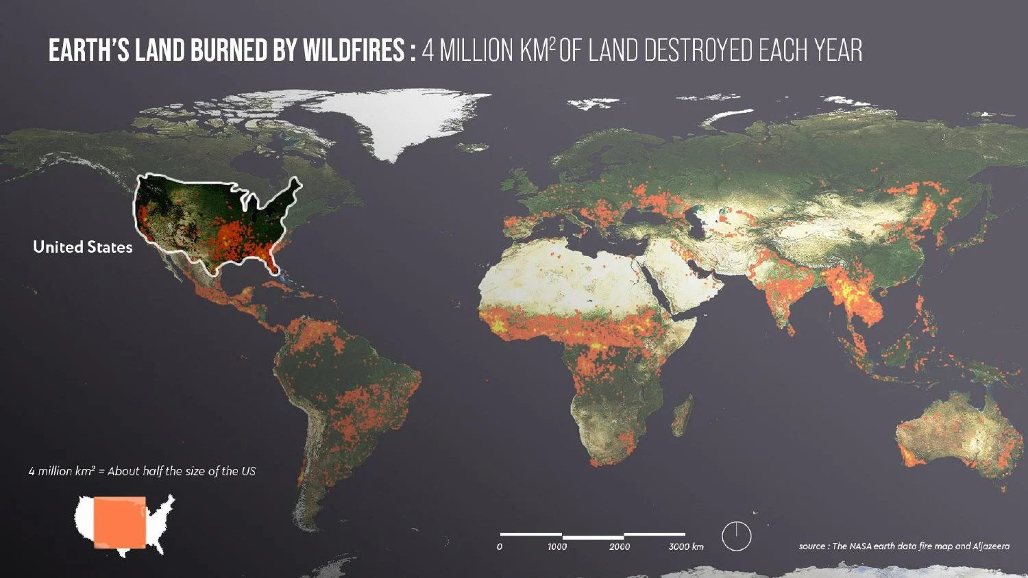 Un des effets dévastateurs du changement climatique consiste en l’augmentation des feux de forêts dans plusieurs régions du monde. Ces feux sauvages sont un phénomène naturel qui permet à la nature de nettoyer les forêts et d’aider au renouvellement de ces dernières qui font place à la lumière régénératrice. Malheureusement, avec le réchauffement climatique, les feux de forêts durent plus longtemps et sont de plus en plus dévastateurs. Ils affectent les zones urbaines situées non loin des forêts et ont fait 6.2 millions de victimes au cours des derniers vingt ans.