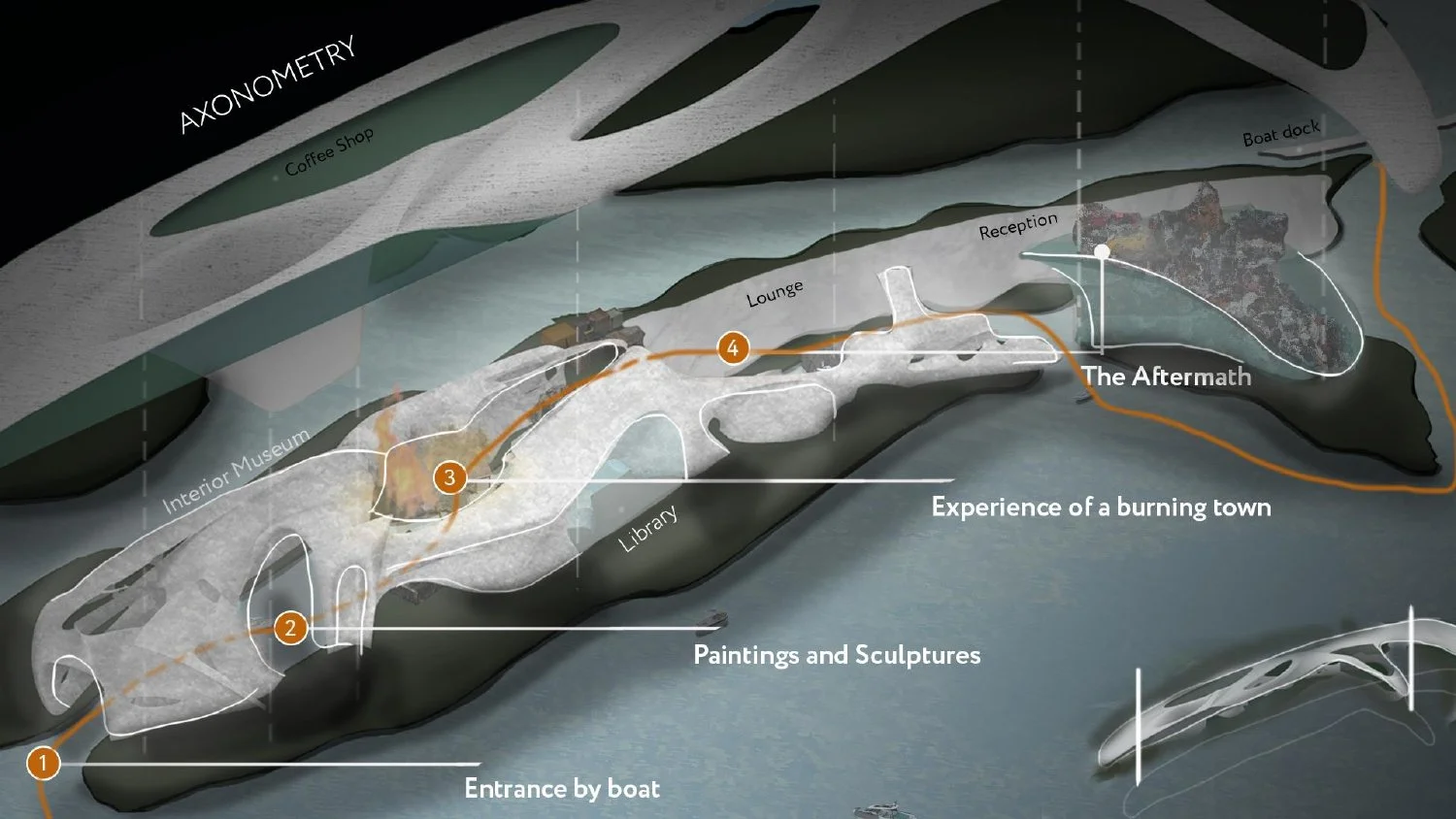Le musée-mémorial propose au travers d’un voyage en bateau, un itinéraire immersif évoquant l’incendie de Paradise. Il propose également une grande bibliothèque publique et des salles d’expositions thématiques permanentes et temporaires, des deux côtés du canal.